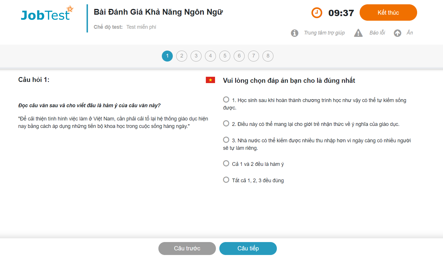 Việc thực hiện những bài test này cũng là dịp rất tốt để các bạn luyện tập thêm khả năng của mình. Để thử sức nhiều hơn, bạn có thể trải nghiệm bài test khả năng ngôn ngữ 01. Bài test này sẽ có nhiều câu hỏi hơn để bạn nâng dần khả năng của mình.