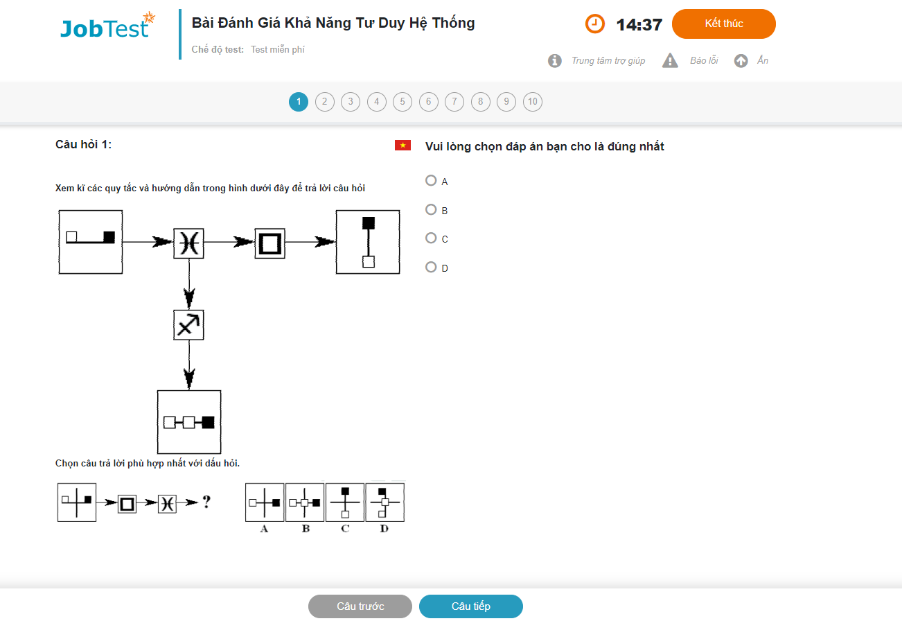 Bạn có thể lựa chọn Bài Test Tư duy Hệ Thống Miễn Phí trên JobTest, làm quen với dạng câu hỏi. Để luyện tập nhiều hơn bạn có thể làm test trên Bài Test Khả Năng Tư duy Hệ Thống 01 với nhiều câu hỏi hơn và phần báo cáo chi tiết hơn. Bạn cũng có thể chọn mua trọn bộ Gói Các Bài Test Khả Năng Tư Duy Hệ Thống để sở hữu cho mình nhiều loại đề đánh giá khác nhau.