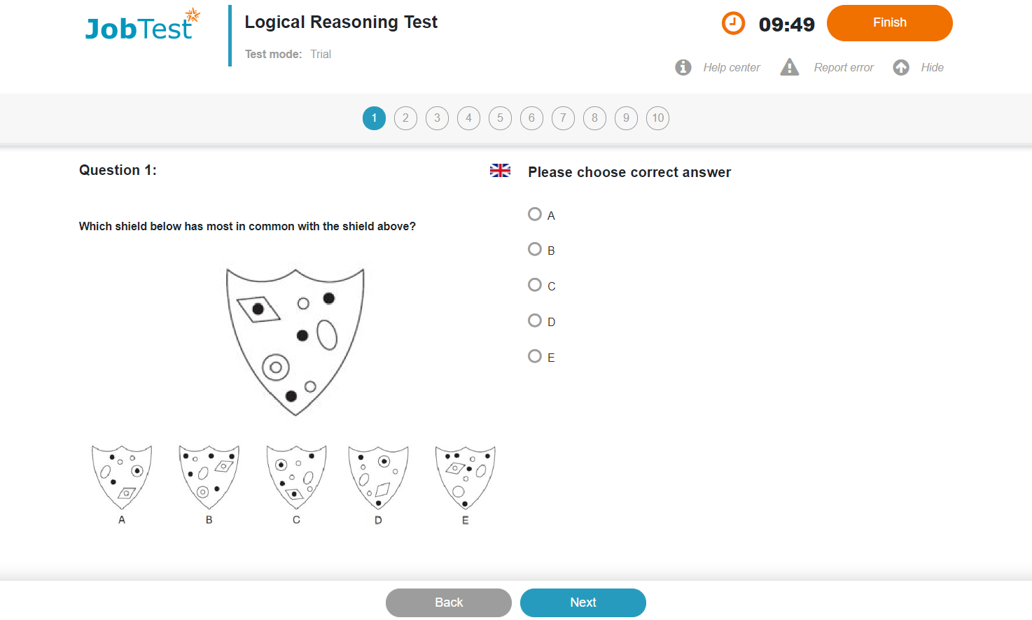 Logical reasoning tests, similar to abstract reasoning and diagrammatic aptitude tests, measure the individual’s ability to work flexibly with unfamiliar information and solve problems. Each test question displays a series of shapes/objects. Candidates’ task is to identify the underlying logical rules of each series and use this information to select the missing shape from a number of options. Candidates who perform well on the inductive reasoning aptitude test tend to demonstrate a better capability for analytical and conceptual thinking.